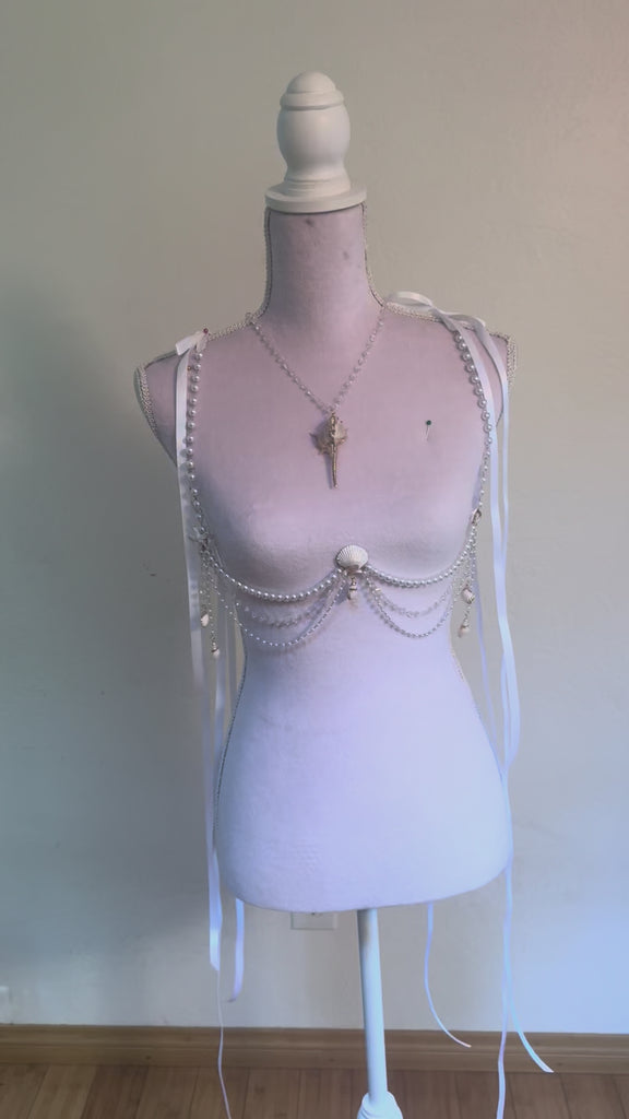 The Shipwrecked Harness drapes across the body like the glittering remains of a shipwrecked treasure chest. Strands of pearls and crystal chains spill like water over the ribs, anchored by seashell charms that feel both delicate and untamed. Designed to be worn over silks, dresses, or bare skin, this harness transforms the body into a canvas of oceanic romance—part armor, part adornment, and entirely siren’s spell.